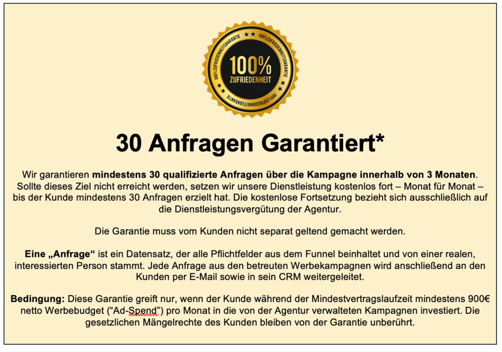 Mindestens 30 qualifizierte Anfragen – oder wir arbeiten kostenlos weiter, bis dieses Ziel erreicht ist.